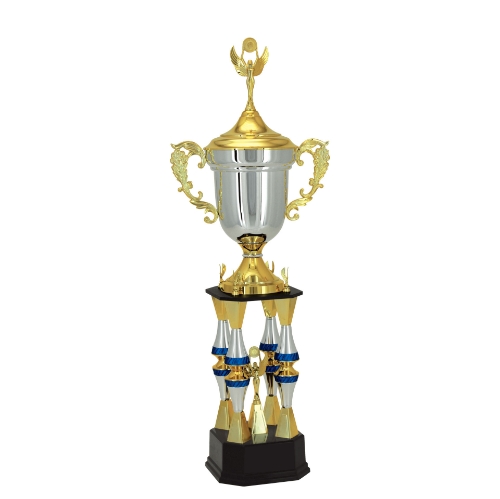 TROFÉU EM POLÍMERO METALIZADO A ALTO VÁCUO MEDIDAS: ALTURA – 118 cm. LARGURA SUPERIOR – 44 cm. LARGURA INFERIOR – 26,50 cm. ALTURA DA BASE- 10,7 cm. PESO APROXIMADO – 4,00 KG CORES- DOURADO, PRATA, AZUL CORES ALTERNATIVAS – CONES EM PRATA E VERMELHO COMPOSIÇÃO: COMPONENTES FABRICADOS EM POLÍMERO: BASE OITAVADA, PIRÂMIDES, CONES, TAMPAS, SUPORTES, TAÇA COM ALÇAS E TAMPA, ESTATUETA SUPERIOR. OUTROS COMPONENTES: BASE EM MDF, FERRAGENS PARA FIXAÇÃO.