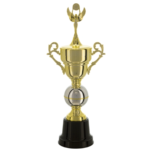 TROFÉU EM POLÍMERO METALIZADO A ALTO VÁCUO MEDIDAS: ALTURA – 80 cm. LARGURA SUPERIOR – 32 cm. LARGURA INFERIOR – 20,80 cm. ALTURA DA BASE- 14,80 cm. PESO APROXIMADO – 2,10 KG CORES- DOURADO, PRATA, PRETO. CORES ALTERNATIVAS: BOLA NAS CORES DOURADA, AZUL, VERMELHA, VERDE OU PRETA. COMPOSIÇÃO: COMPONENTES FABRICADOS EM POLÍMERO: BASE REDONDA, SUPORTES, BOLA, ANEL, TAÇA COM ALÇA E TAMPA E ESTATUETA SUPERIOR. OUTROS COMPONENTES: FERRAGENS PARA FIXAÇÃO.