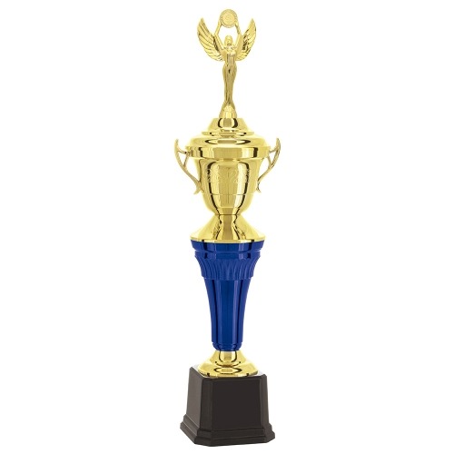 TROFÉU EM POLÍMERO METALIZADO A ALTO VÁCUO MEDIDAS: ALTURA – 68 cm. LARGURA SUPERIOR – 18,70 cm. LARGURA INFERIOR – 13,10 cm. ALTURA DA BASE- 10 cm. PESO APROXIMADO – 1,30 KG CORES – DOURADO, PRETO, AZUL CORES ALTERNATIVAS: CONE NAS CORES VERMELHA, VERDE OU DOURADA COMPOSIÇÃO: COMPONENTES FABRICADOS EM POLÍMERO: BASE OITAVADA, SUPORTE, CONE COM TAMPA, TAÇA COM ALÇAS E TAMPA, ESTATUETA SUPERIOR. OUTROS COMPONENTES: FERRAGENS PARA FIXAÇÃO