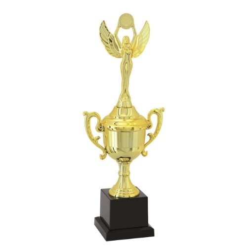 TROFÉU EM POLÍMERO METALIZADO A ALTO VÁCUO MEDIDAS: ALTURA – 33 cm. LARGURA SUPERIOR – 12,50 cm. LARGURA INFERIOR – 7,50 cm. ALTURA DA BASE- 6 cm. PESO APROXIMADO – 300 gr CORES – DOURADO E PRETO CORES ALTERNATIVAS: SUPORTE, TAÇA COM ALÇAS, TAMPA E ESTATUETA SUPERIOR NA COR PRATA. COMPOSIÇÃO: COMPONENTES FABRICADOS EM POLÍMERO: BASE QUADRADA, SUPORTE, TAÇA COM ALÇAS E TAMPA, ESTATUETA SUPERIOR. OUTROS COMPONENTES: FERRAGENS PARA FIXAÇÃO
