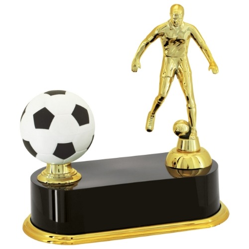 ESTATUETAS FIXAS DE BOLA E JOGADOR DE FUTEBOL.