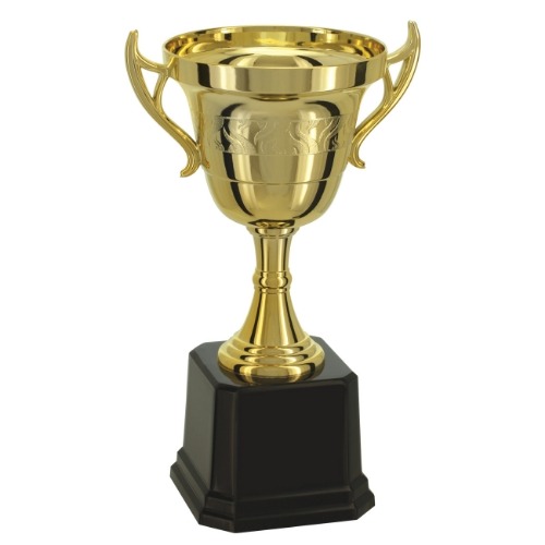 TROFÉU EM POLÍMERO METALIZADO A ALTO VÁCUO MEDIDAS: ALTURA – 27 cm. LARGURA SUPERIOR – 16 cm. LARGURA INFERIOR – 10,10 cm. ALTURA DA BASE- 7,50 cm. PESO APROXIMADO – 650 gr CORES – DOURADO, PRETO CORES ALTERNATIVAS: CONE, TAÇA COM ALÇAS NAS CORES DOURADO OU PRATA. COMPOSIÇÃO: COMPONENTES FABRICADOS EM POLÍMERO: BASE OITAVADA, CONE, TAÇA COM ALÇAS E PINTURA INTERNA. OUTROS COMPONENTES: FERRAGENS PARA FIXAÇÃO