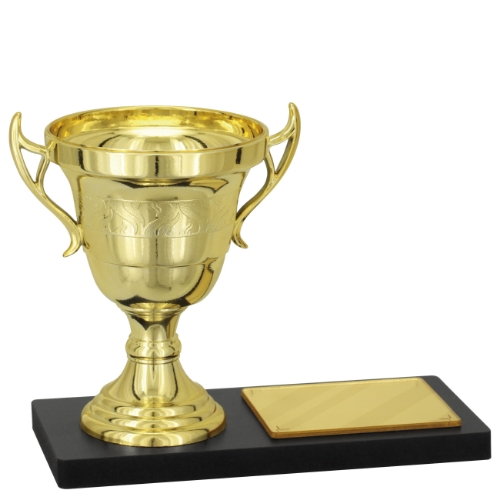 Placa de MDF retangular medindo 14 cm por 6 cm e com 9 mm de espessura na cor preta. Sobre esta placa um suporte fabricado em polímero, metalizado a alto vácuo e pintado na cor dourado. Sobre este suporte uma taça aberta com detalhes texturizados, medindo 9,20 cm de largura a partir as alças, fabricada em polímero metalizado a alto vácuo, pintada na cor dourado. Ainda sobre esta placa um aplique em acrílico espelhado em formato retangular. Altura total da placa – 11 cm.