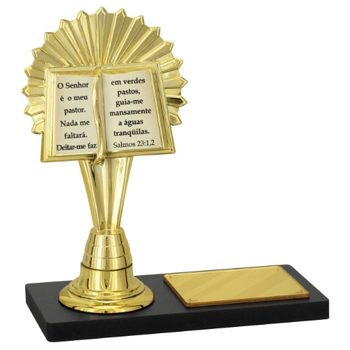 Placa de MDF retangular medindo 14 cm por 6 cm e com 9 mm de espessura na cor preta. Sobre esta placa um suporte fabricado em polímero, metalizado a alto vácuo e pintado na cor dourado. Sobre este suporte uma estatueta de bíblia, com detalhes em vinil, medindo 12,50 cm de altura, fabricada em polímero metalizado a alto vácuo, pintada na cor dourado. Ainda sobre esta placa um aplique em acrílico espelhado em formato retangular. Altura total da placa – 15 cm