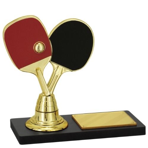 Placa de MDF retangular medindo 14 cm por 6 cm e com 9 mm de espessura na cor preta. Sobre esta placa um suporte fabricado em polímero, metalizado a alto vácuo e pintado na cor dourado. Sobre este suporte uma estatueta de raquetes de tênis de mesa com apliques em vinil nas cores vermelha e preta, medindo 10,50 cm de altura, fabricada em polímero metalizado a alto vácuo, pintada na cor dourado. Ainda sobre esta placa um aplique em acrílico espelhado em formato retangular. Altura total da placa – 13 cm.