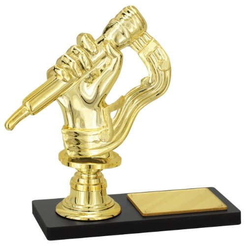 Placa de MDF retangular medindo 14 cm por 6 cm e com 9 mm de espessura na cor preta. Sobre esta placa um suporte fabricado em polímero, metalizado a alto vácuo e pintado na cor dourado. Sobre este suporte uma estatueta de peixe, medindo 12,20 cm de altura, fabricada em polímero metalizado a alto vácuo, pintada na cor dourado. Ainda sobre esta placa um aplique em acrílico espelhado em formato retangular. Altura total da placa – 15 cm.