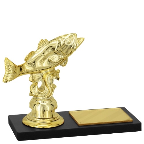 Placa de MDF retangular medindo 14 cm por 6 cm e com 9 mm de espessura na cor preta. Sobre esta placa um suporte fabricado em polímero, metalizado a alto vácuo e pintado na cor dourado. Sobre este suporte uma estatueta de peixe, medindo 8,20 cm de altura, fabricada em polímero metalizado a alto vácuo, pintada na cor dourado. Ainda sobre esta placa um aplique em acrílico espelhado em formato retangular. Altura total da placa – 11 cm.