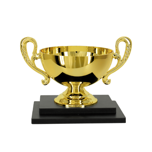 TROFÉU EM POLÍMERO METALIZADO COM BASE EM MDF MEDIDAS: ALTURA – 14 cm. LARGURA SUPERIOR – 21 cm – LARGURA INFERIOR – 16,50 cm – ALTURA DA BASE – 1,8 CM – PESO APROXIMADO – 0,350 KG CORES- DOURADO E PRETO COMPOSIÇÃO: COMPONENTES FABRICADOS EM POLÍMERO: SUPORTE E COPA COM ALÇAS. OUTROS COMPONENTES: FERRAGENS PARA FIXAÇÃO, BASE SOBREPOSTA EM DUAS CAMADAS DE MDF.