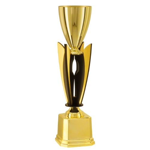 Troféu com altura de 88 cm, base octogonal com 21,50 cm de largura fabricada em polímerometalizada a alto vácuo e pintada na cor dourada, sobre essa base um suporte fabricado empolímero e metalizado a alto vácuo e pintado na cor dourada.