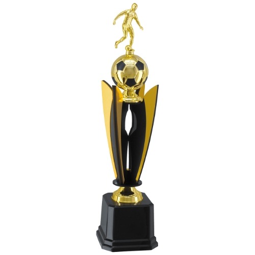Troféu com altura de 89 cm, base octogonal com 21,50 cm de largura fabricada em polímerona cor preta, sobre essa base um suporte fabricado em polímero e metalizado a alto vácuo epintado na cor dourada.
